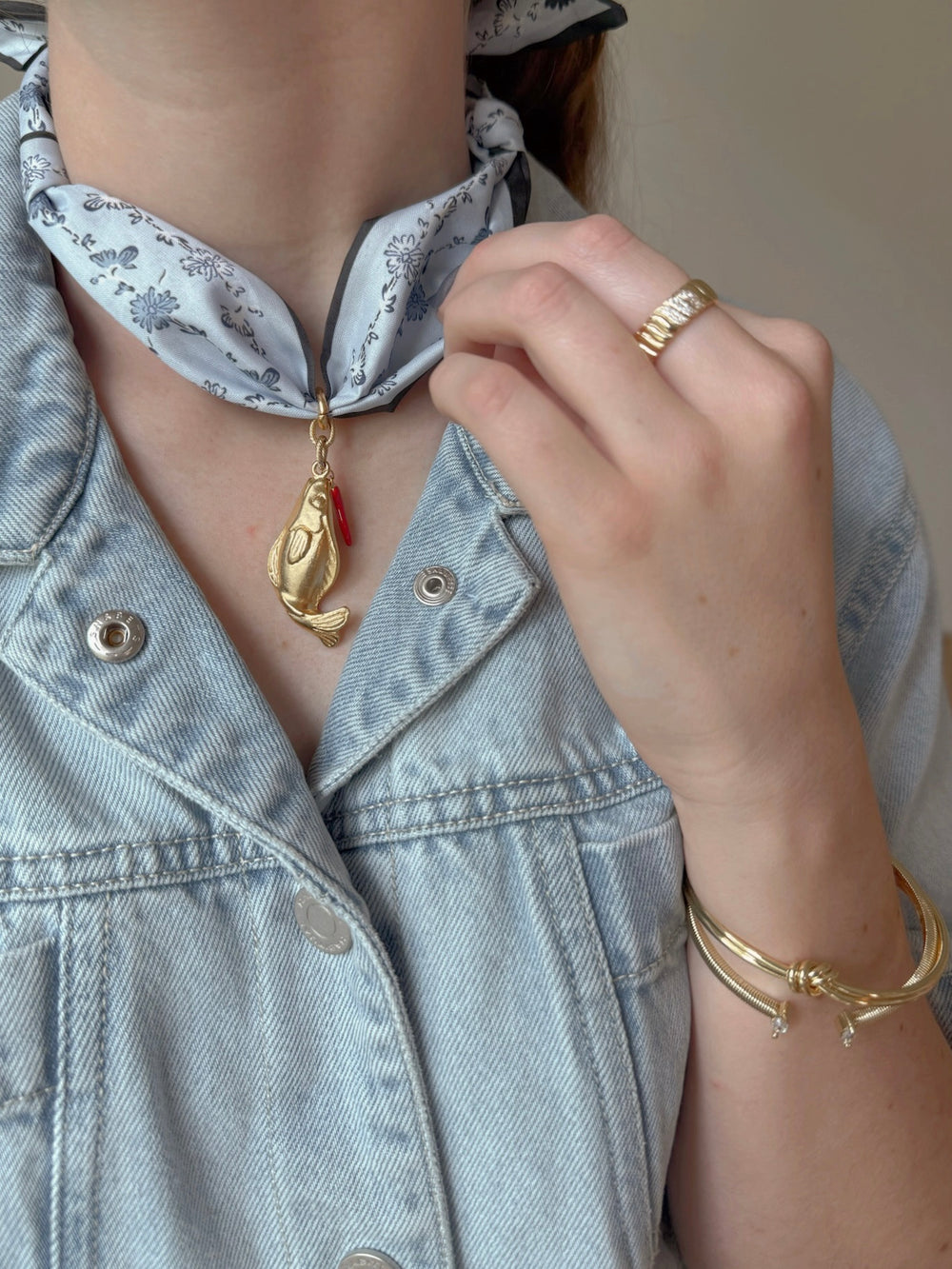 Each scarf necklace is truly one of a kind — featuring a hand-selected vintage pendant paired with a soft, patterned scarf. The gold fish pendant adds a bold yet timeless touch, while the adjustable design lets you wear it your way: around the neck, in your hair, or tied to your favorite bag.