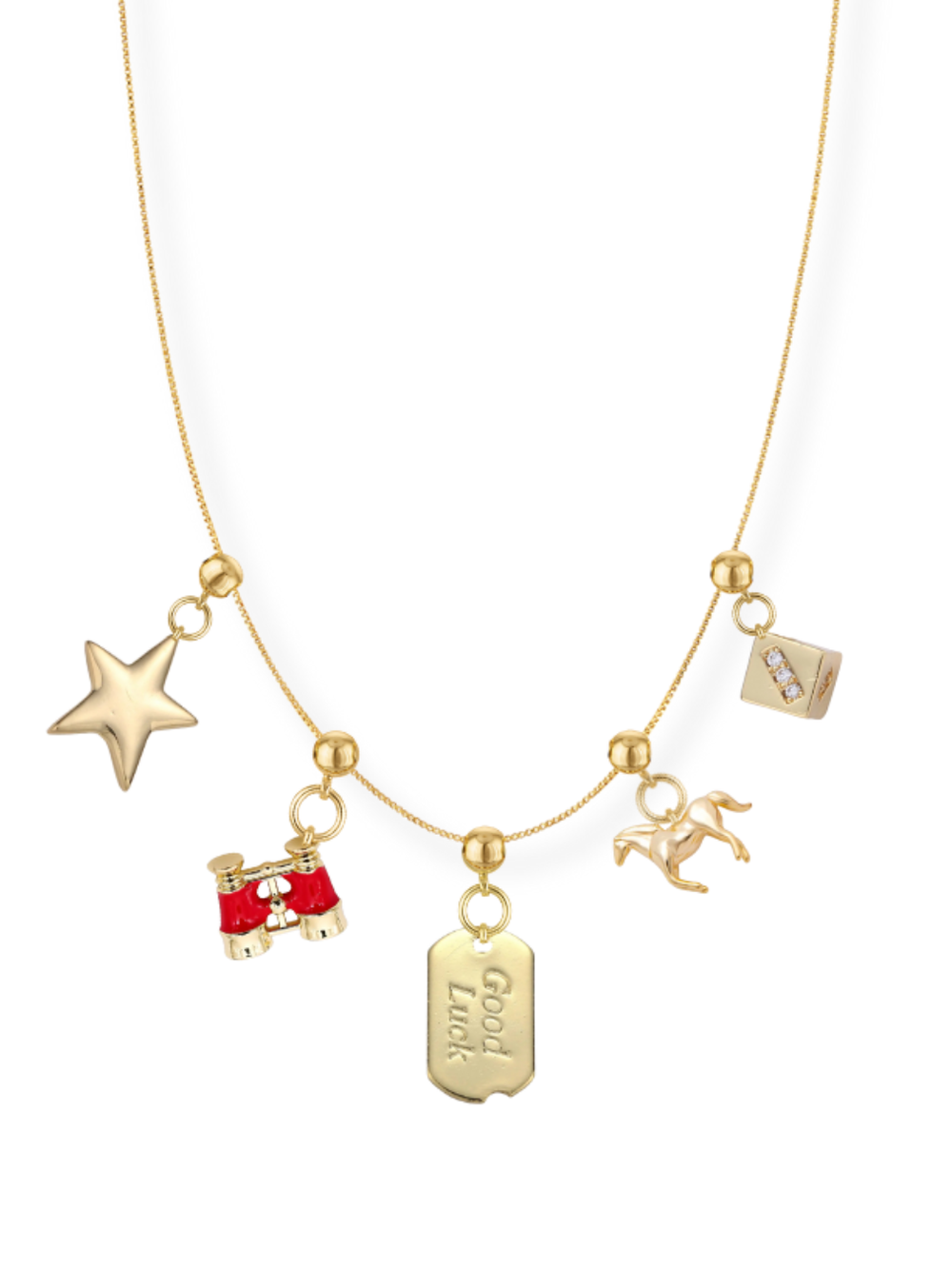 - This necklace features a sleek box-style chain adorned with curated gold charms, including a star, Binocular Grip Charm, Good Luck Grip Charm, Horse Grip Charm, and Dice Grip Charm. Each symbolizes good fortune, curiosity, courage, and the free-spirited beauty of chasing what you love.