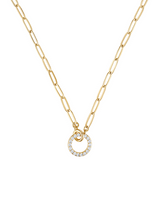 - This necklace features an elongated paperclip chain with a petite smooth circle that interlocks with a big micro pave CZ circle pendant.